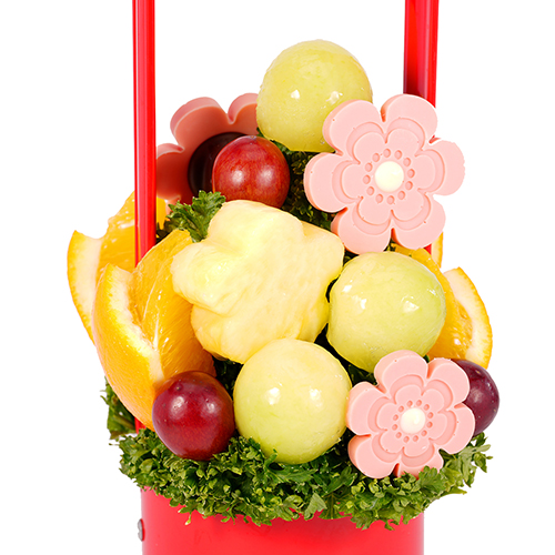 sphereにしたメロンとお花の形のチョコレートをかわいくデザインした女性に人気の夏のフルーツブーケです。