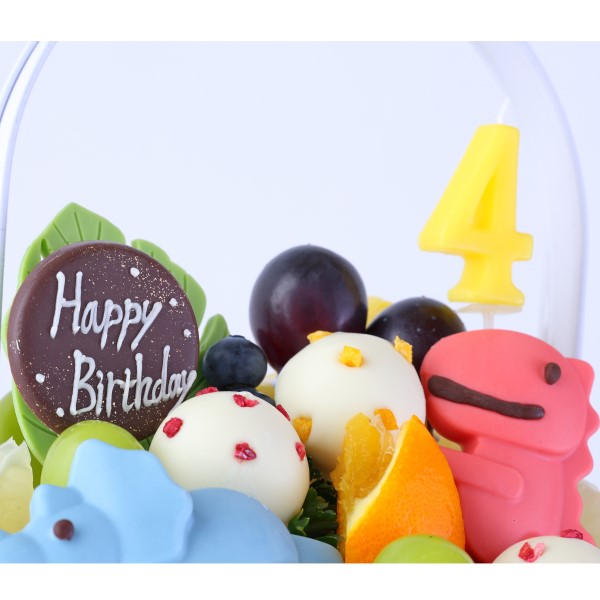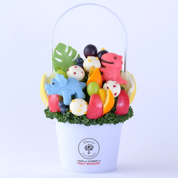 コロンとかわいい“恐竜のたまご”や大きな“恐竜チョコ”が主役の、お子様のための特別なフルーツブーケです。