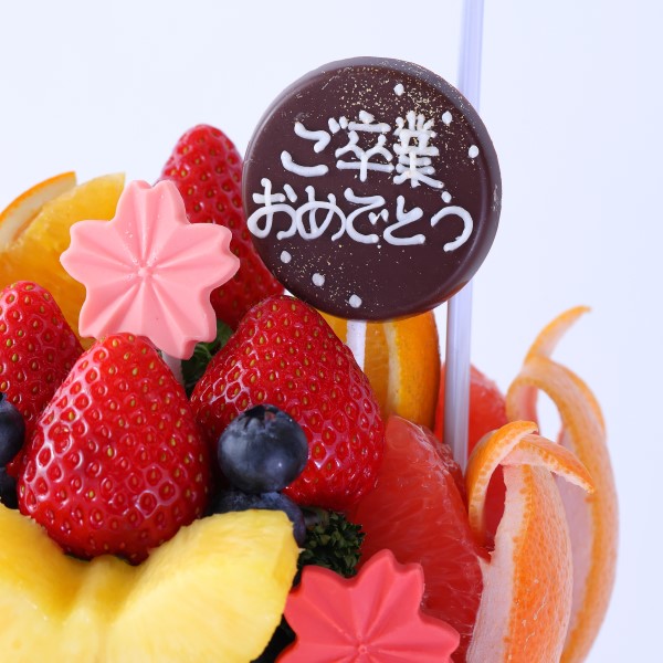 フルーツとチョコレートで春の季節を彩る桜の花をアレンジメントしたフルーツブーケに、「ご卒業おめでとう」の文字入りのチョコレートプレートを添えました。