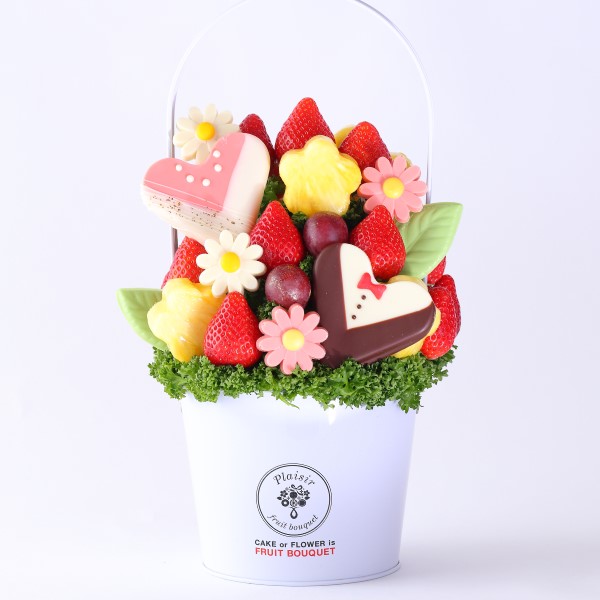 周囲には可愛らしいお花のチョコレートと、色とりどりのフルーツをアレンジし、上品かつ華やかな仕上がりに。