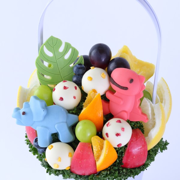 コロンとかわいい“恐竜のたまご”や大きな“恐竜チョコ”が主役の、お子様のための特別なフルーツブーケです。