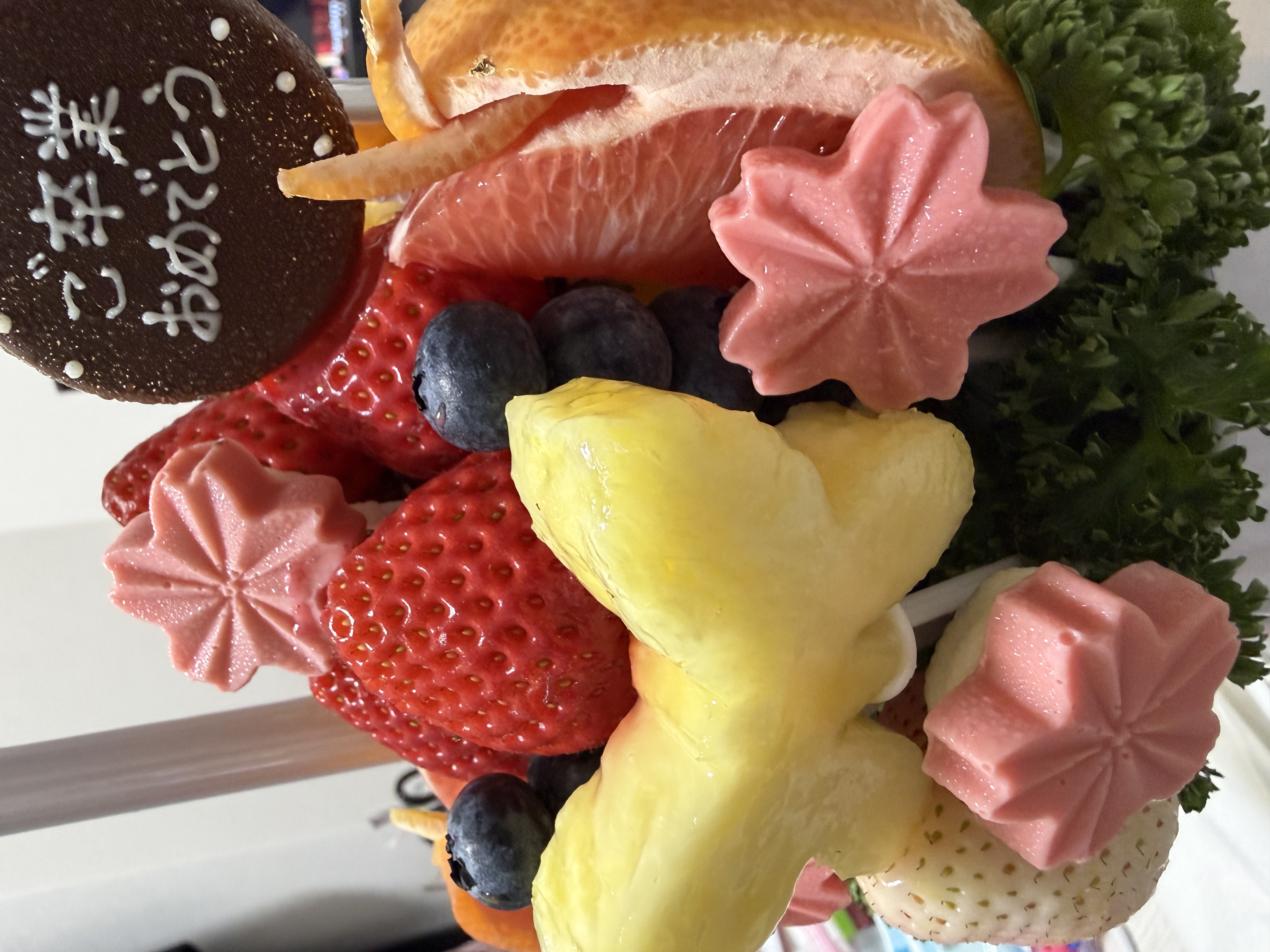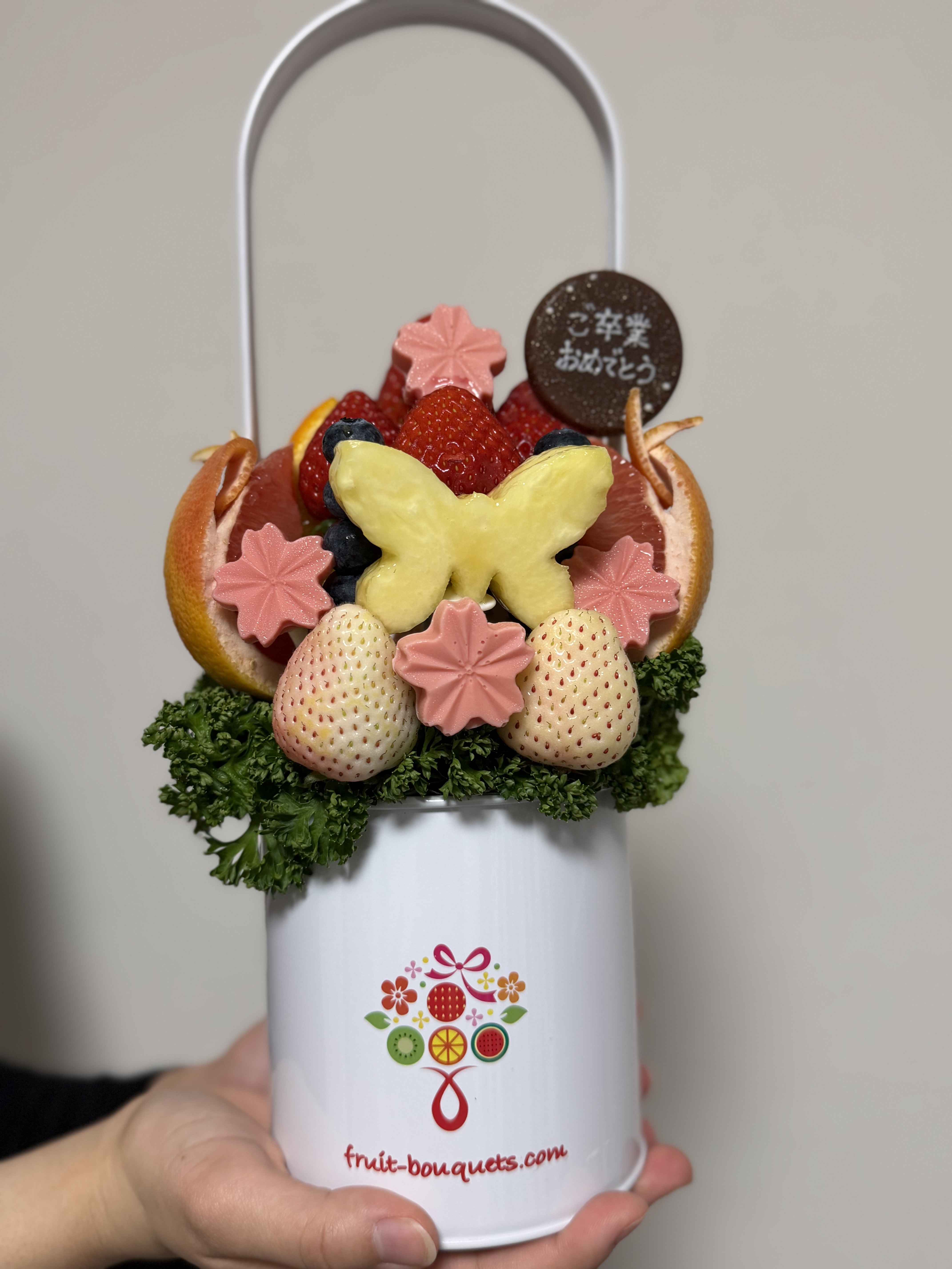 フルーツとチョコレートで春の季節を彩る桜の花をアレンジメントしたフルーツブーケに、「ご卒業おめでとう」の文字入りのチョコレートプレートを添えました。