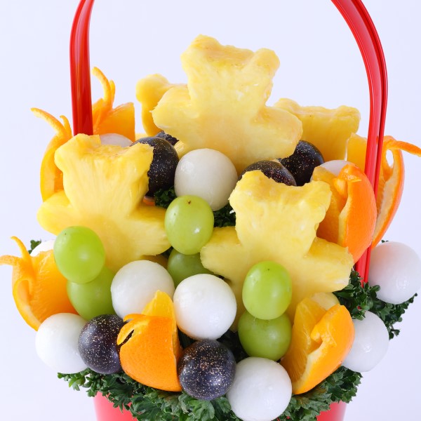 くまさんの形にカットされたパイナップルと、ころんと丸くくり抜かれた旬の梨が主役。